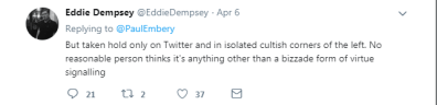 He was joined by Eddie Dempsey, who is also making a big play of being a white and working class and has started to make a career out of playing with some very dangerous politics – accusing some people of allying themselves with ethnic minorities to secure power and using far right tropes about George Soros to attack political opponents – coincidentally very similar to Embery’s recent tweet about ‘rootless cosmopolitians’ – another anti-Semitic slur). Apparently no ‘reasonable person’ could possibly be against more immigration controls and a capitalist state restricting people’s rights or freedoms.