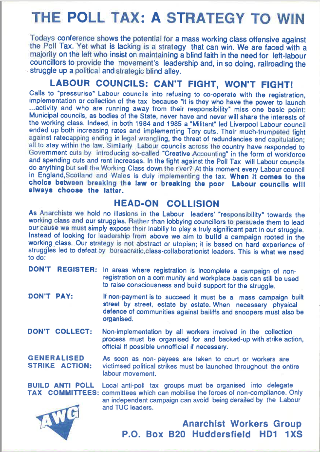 Previous ImageNext Image AWG strategy to stop the poll tax Leaflet by the Anarchist Workers Group urging campaigners not to bother “pressuring Labour councillors”